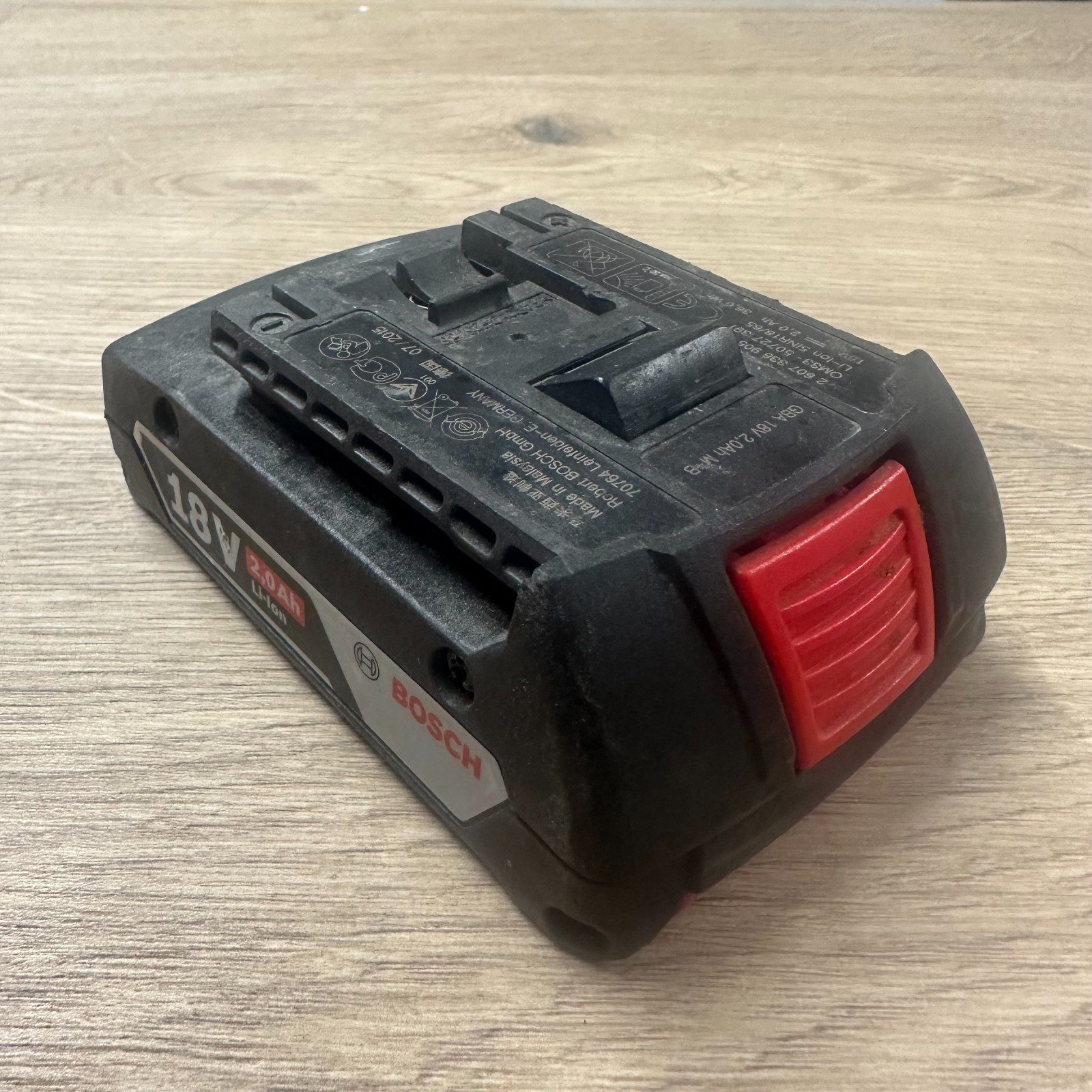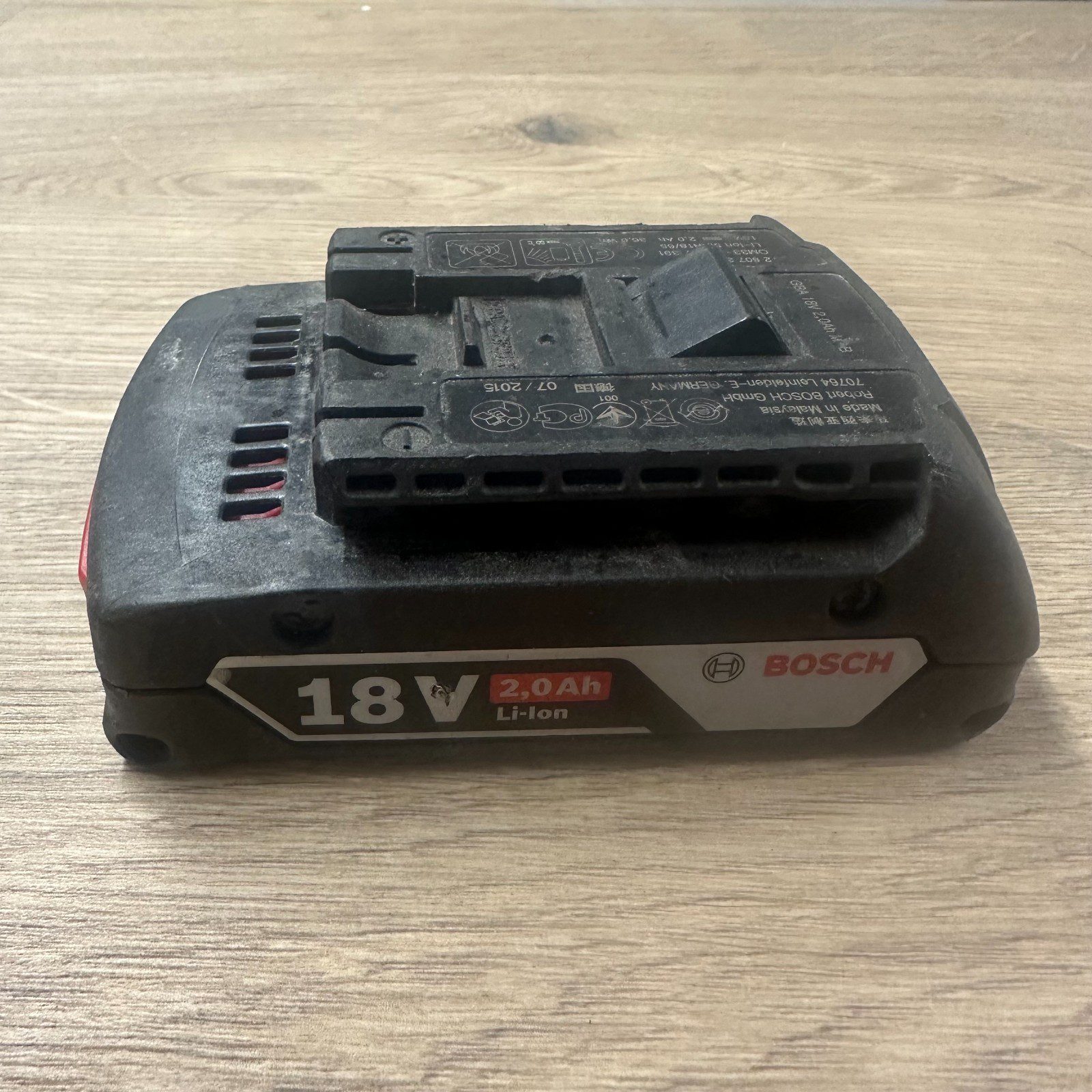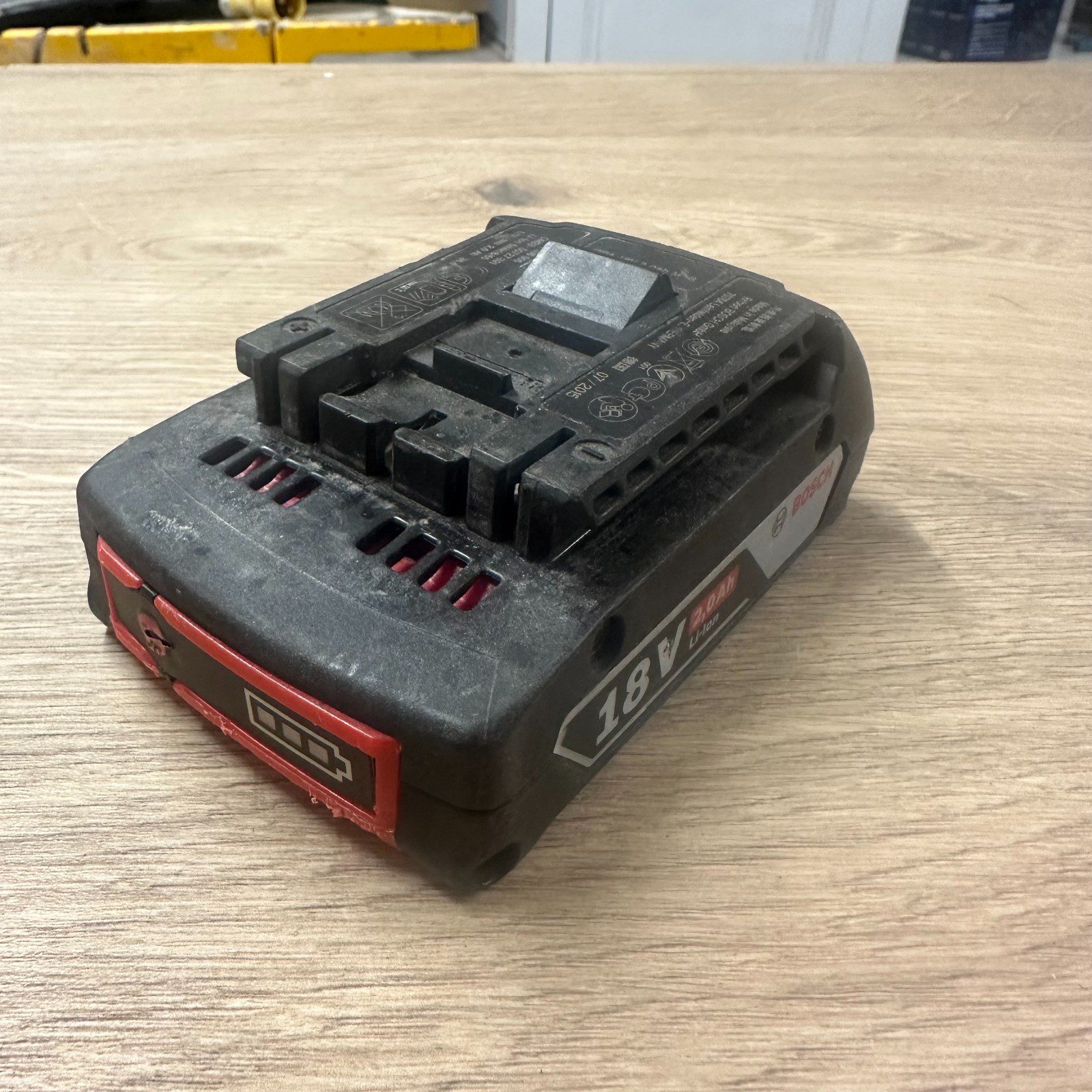 Genuine Bosch Professional 18V lithium-ion battery with 2.0Ah capacity. Fully tested and working. Battery holds charge and the charge indicator lights function correctly, as shown in the photos.