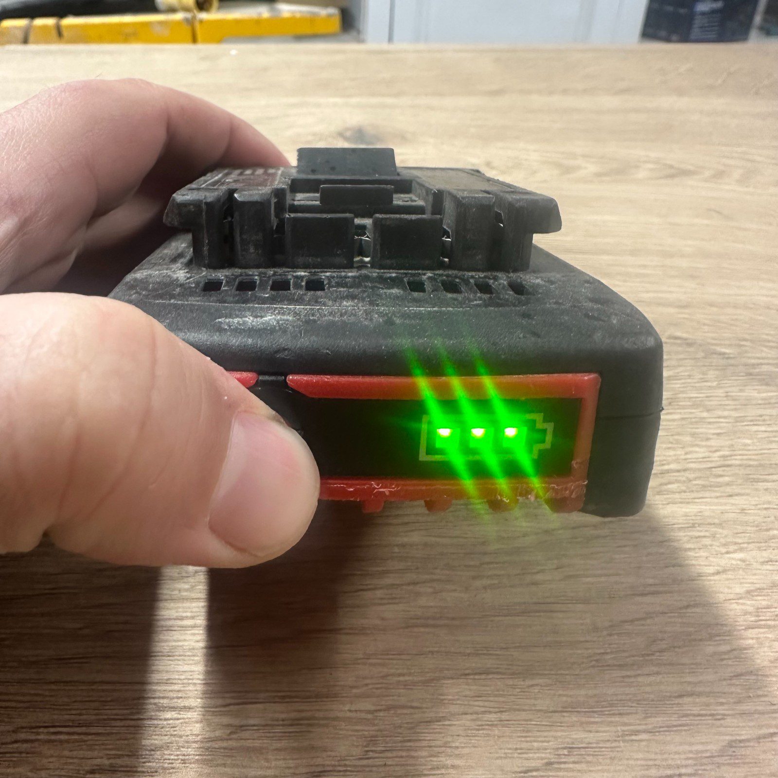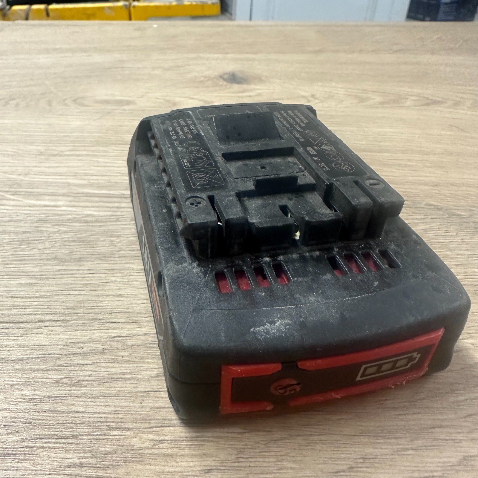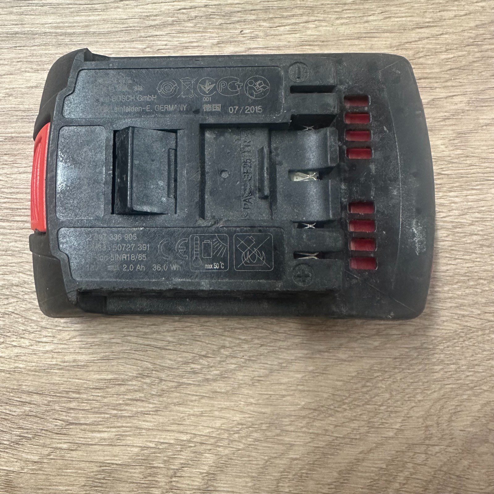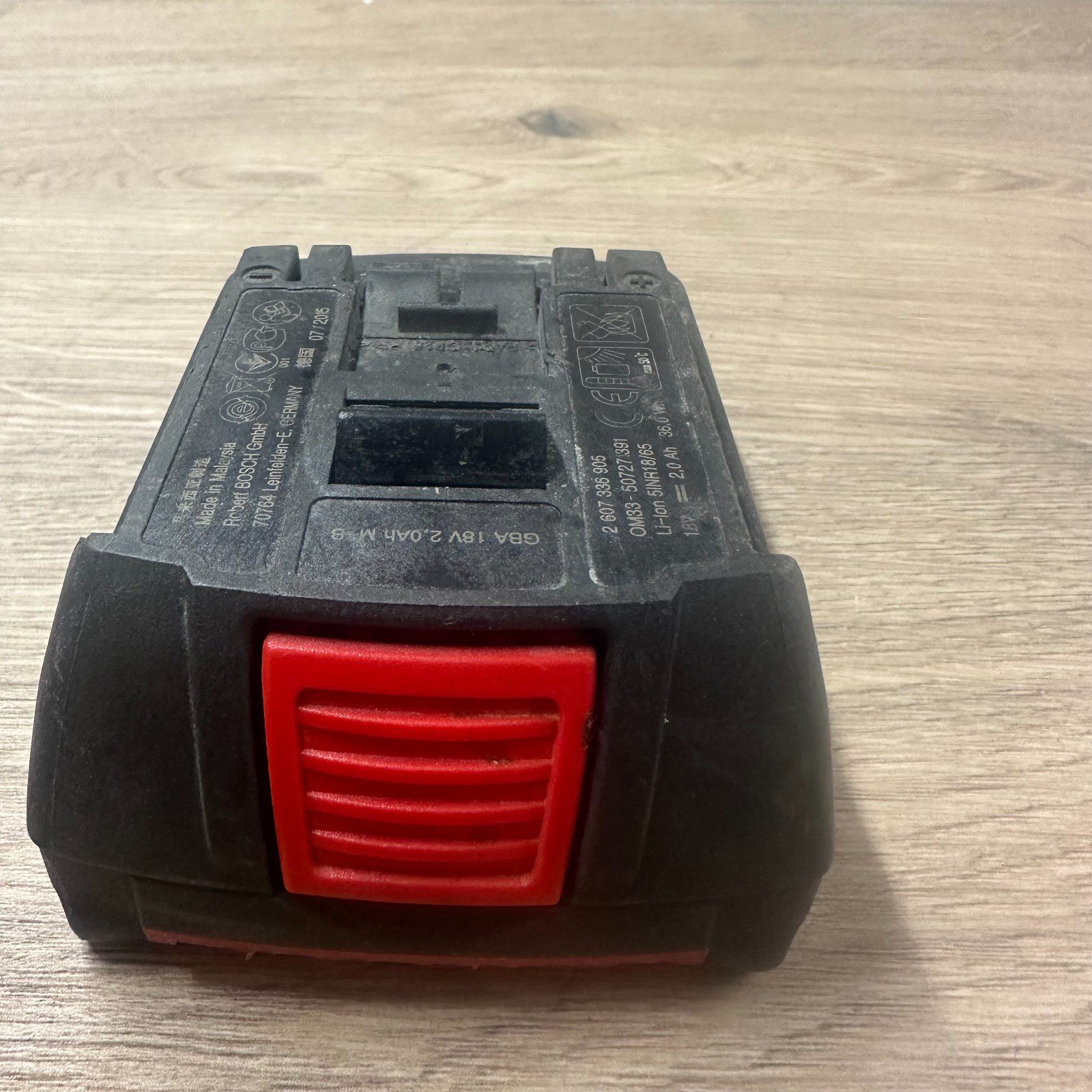 Genuine Bosch Professional 18V lithium-ion battery with 2.0Ah capacity. Fully tested and working. Battery holds charge and the charge indicator lights function correctly, as shown in the photos.